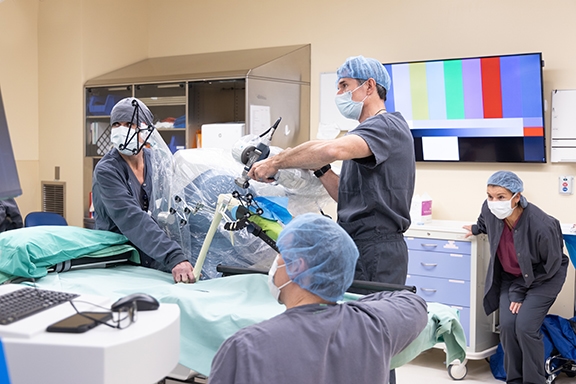 NIHD Orthopedic surgeon Dr. Richard Meredick (center) leads the NIH Surgery team through a mock Mako SmartRobotics-assisted total knee replacement. ...